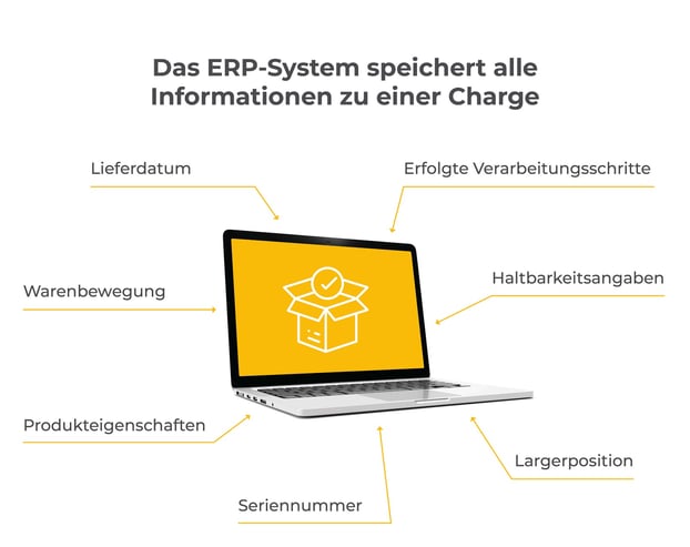 Ein ERP-System vergibt die Chargennummer für ein Produkt, sobald ein Produktionsauftrag freigegeben wird. Es speichert, welche Rezeptur für diese Charge zum Einsatz kommt, gleicht die nötigen Ressourcen mit den Lagerbeständen ab und verbucht die verwendeten Rohstoffe aus der jeweiligen Materialcharge.